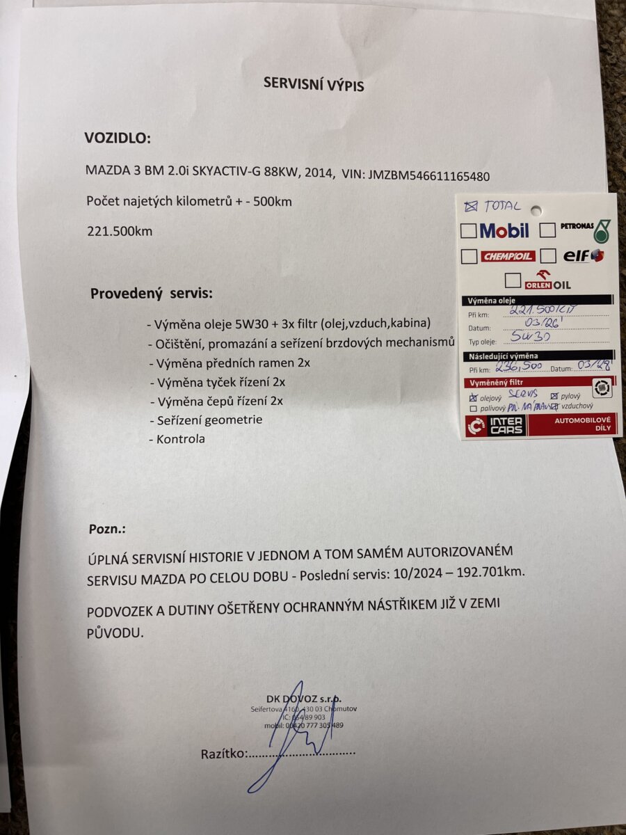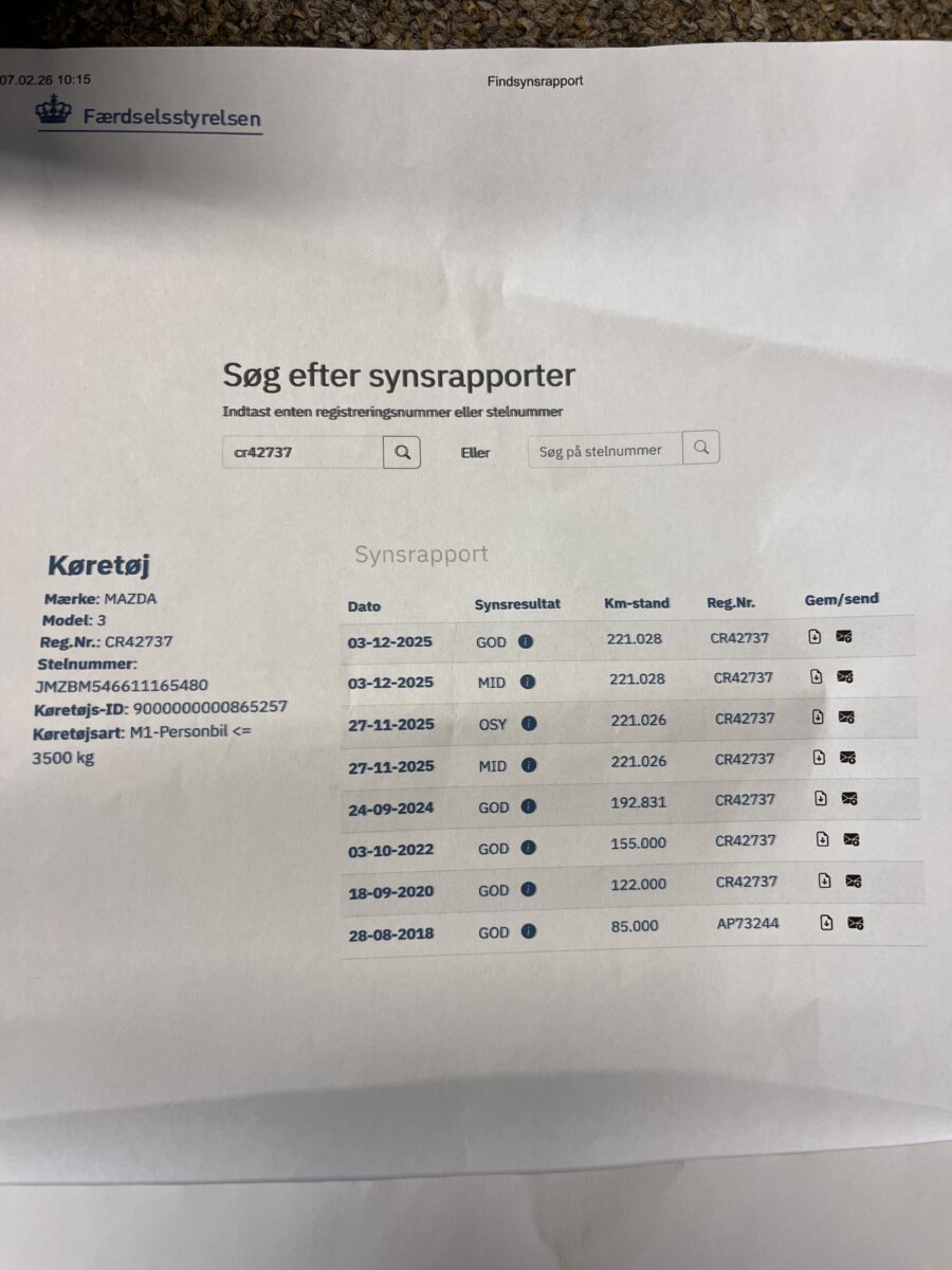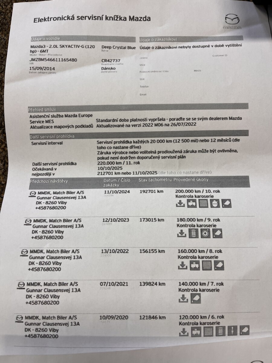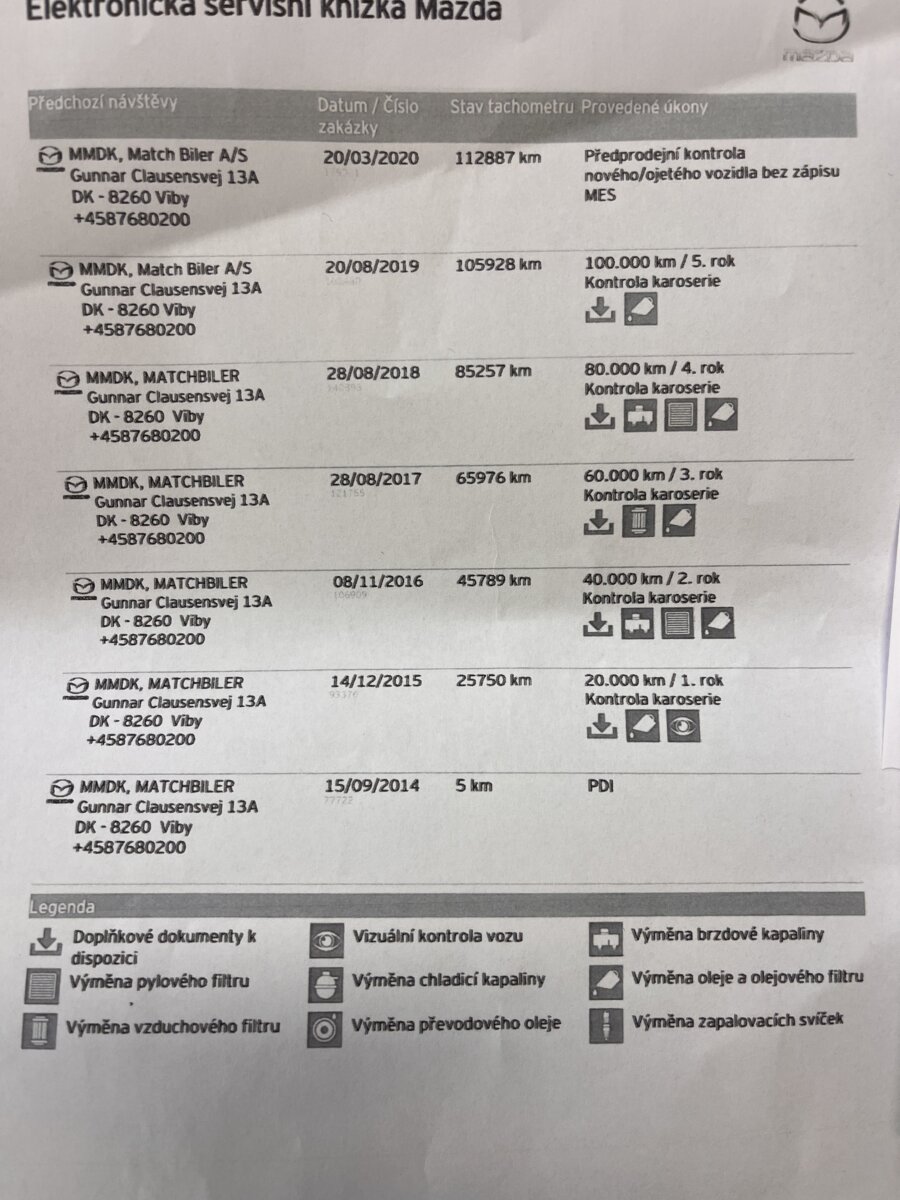 Doložitelná historie – podrobný výpis z Dánské STK + ÚPLNÁ SERVISNÍ HISTORIE V JEDNOM A TOM SAMÉM AUTORIZOVANÉM SERVISU MAZDA PO CELOU DOBU – Poslední servis: 10/2024 – 192.701km.