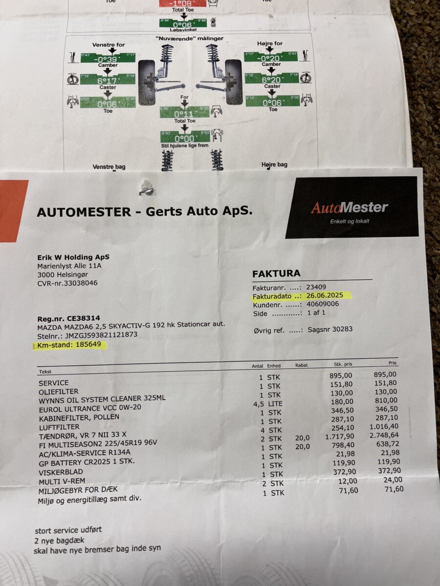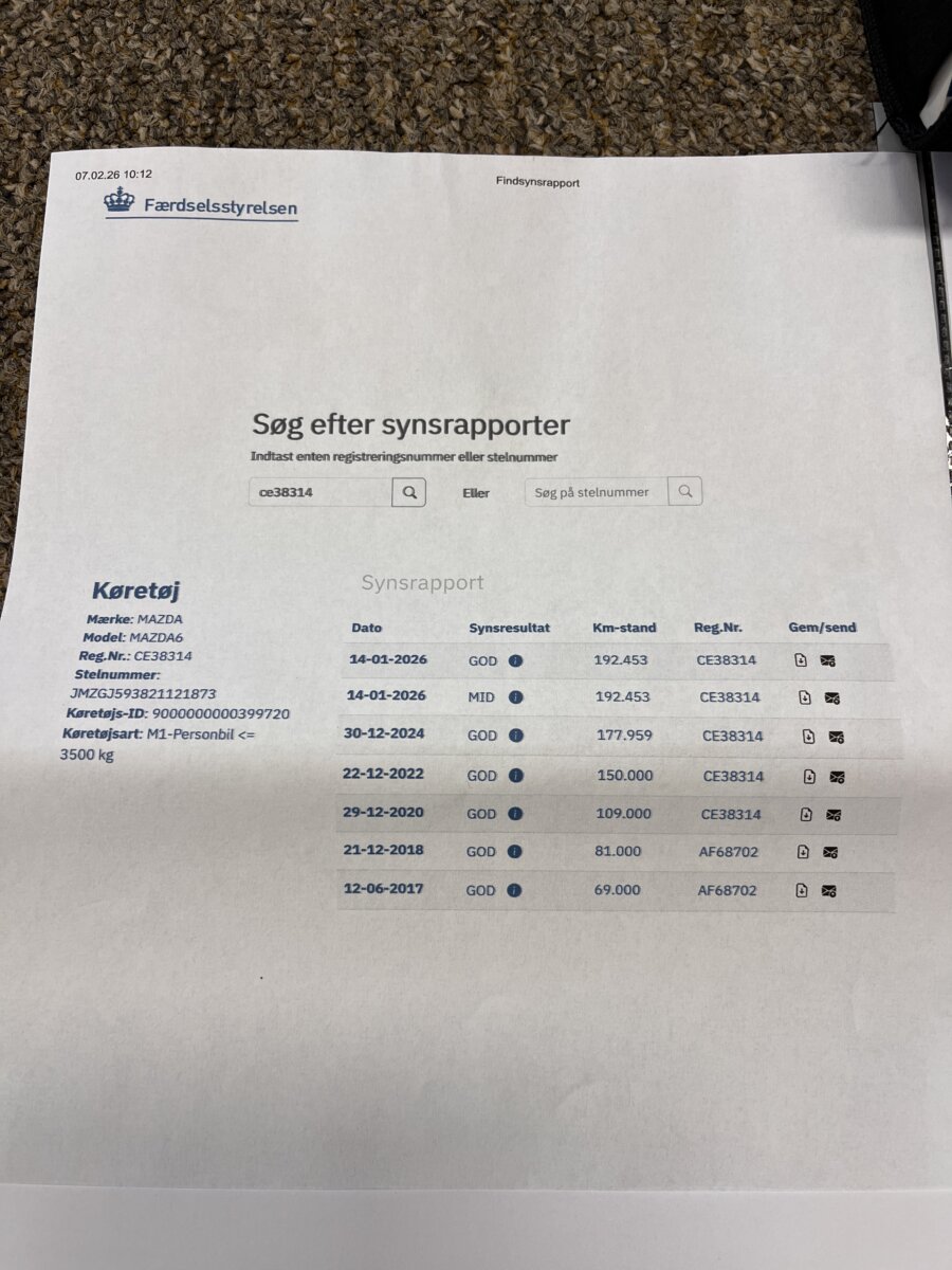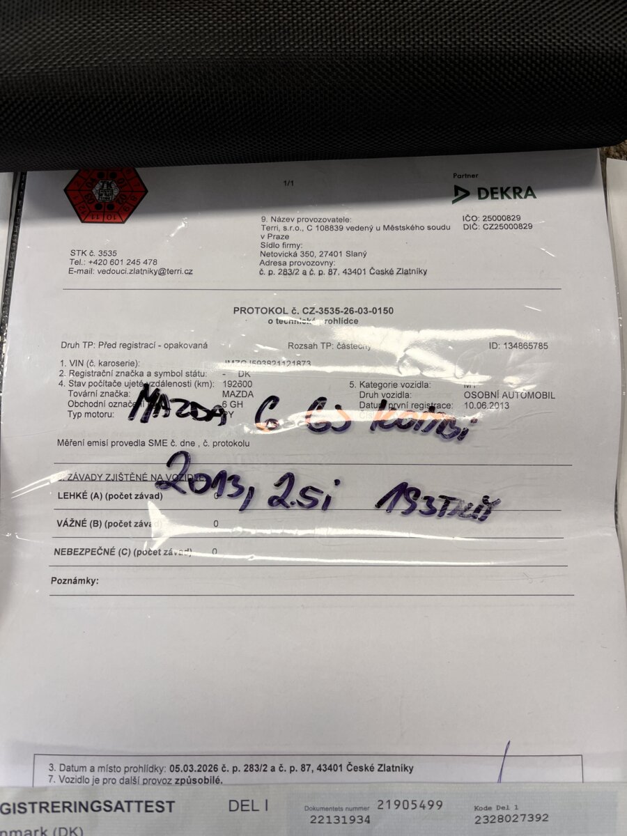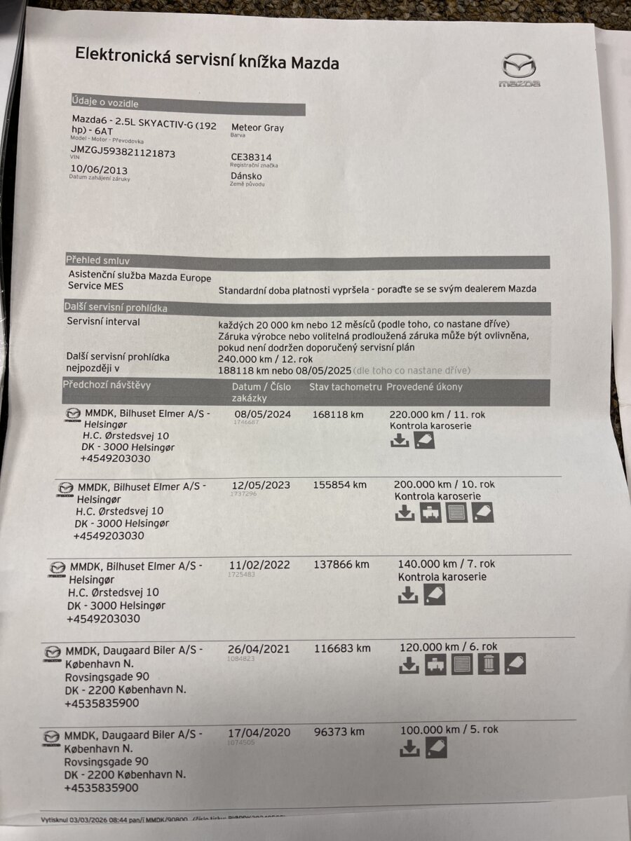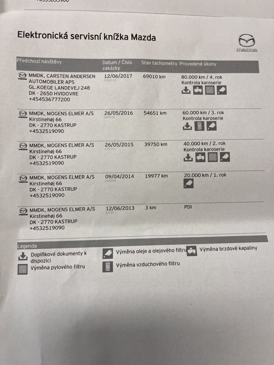 Doložitelná historie – podrobný výpis z Dánské STK + Výpis ze servisní historie v Mazdě (do r.24) + faktury za servis.