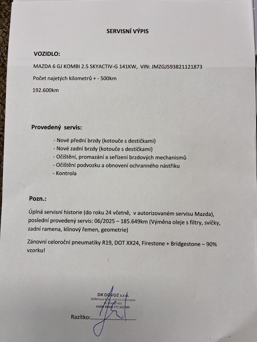 • Úplná servisní historie (do roku 24 včetně, v autorizovaném servisu Mazda), poslední provedený servis: 06/2025 – 185.649km (Výměna oleje s filtry, svíčky, zadní ramena, klínový řemen, geometrie)